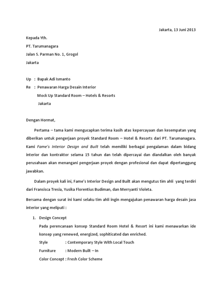 Dengan hormat, menindaklanjuti pembicaraan dengan bapak pada waktu lalu, kami selaku pihak jasa konsultan desain menyanggupi pekerjaan yang bapak tawarkan dengan perincian.