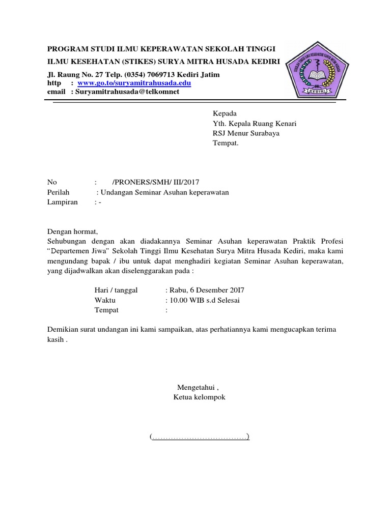 Ingat yha, kasus nya pasti akan berbeda dengan kasus kegiatan seminar anda, jdi silahkan diubah sesuai. Surat tersebut biasanya mengundang seseorang atau instansi untuk membahas hal yang bersifat penting, entah itu berupa rapat, seminar, dan lainnya. Bentuk surat undangan juga disesuaikan dengan kegiatan apa yang akan dilaksanakan, dimana. Kepala unit pendidikan kecamatan prambanan. Contoh surat undangan seminar merupakan jenis surat yang digunakan untuk mengundang seseorang untuk ikut atau berpartisipasi surat undangan seminar ini termasuk ke dalam golongan surat resmi.